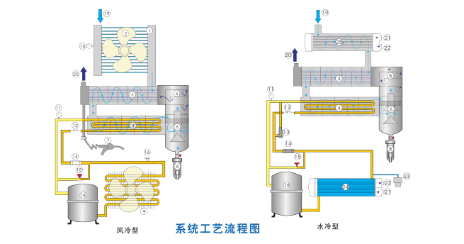 制冷劑在制冷壓縮機 內增壓后,經冷凝器 或 冷卻,再經 轉化為低溫液體進蒸發(fā)器④吸收壓縮空氣中 的熱量后汽化,經氣液分離器后進制冷壓縮機循環(huán)壓縮。